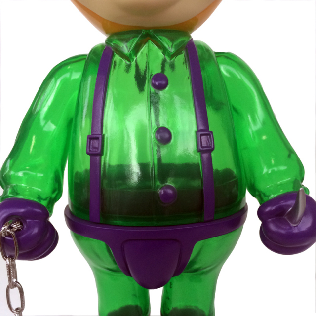 We, BlackBook Toy, are proud to announce the collaboration project with legendary lowbrow artist, Frank Kozik!! Homage to his beloved movie, A Clockwork Orange, Dim got Frank Kozik's treatment!! Here comes "A Clockwork Carrot" series!! Standing 11.25" tall. Made in Japan Sofubi toy!! Which means undeniable quality!! This Enigma Edition is clear green cast! Only genuine JAPANESE SOFUBI can have this beauty!! His head, hands, boots and codpiece are hand painted based off that villain, which makes the beauty of clear body stands out more. Perfect matching colorway with Lil Alex Enigma Edition, which would be on sale at the same time.