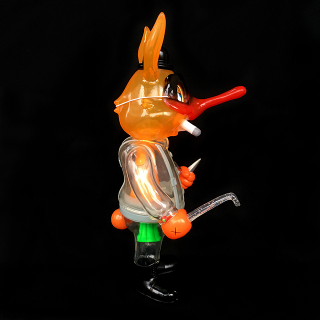 We, BlackBook Toy, are proud to announce the collaboration project with legendary lowbrow artist, Frank Kozik!! Homage to his beloved movie, A Clockwork Orange, Alex got Frank Kozik's treatment!! Here comes "A Clockwork Carrot" series!! Standing 11.25" tall. Made in Japan Sofubi toy!! Which means undeniable quality!! This Bait Edition is clear casted body and clear orange casted head. Plus comes with "that" notorious mask as you seen in that "break in" scene. Painted in clear red to match clear casted Lil Alex. You can see through his nose even when he's wearing that mask. Not just that, this edition comes with new part, Carrot. You can enjoy putting this carrot inside. Engraved KOZIK logo. Lil Alex itself and his mask is sculpted by T9G and carrot is sculpted and hand casted by Chop of Monster Farm.