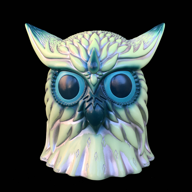 1600yen(Asia),2200yen.(North/Central America, Europe,Oceania), 3000yen(South America, Africa).We,BlackBook Toy, are proud to announce Sofubi project with Jeff Soto. It's called "NekoFukurou". "Neko" is "Cat" and "Fukurou" is "Owl" in Japanese. Combining 2 popular animals spotted on Jeff Soto's artworks into a "MADE IN JAPAN" sofubi toy. Japanese craftsman hand sprayed on GID casted sofubi. This "NekoFukurou" stands on each other so that you can make your "NekoFukurou" totem pole. This is "Night" Edition. It glows really well in the dark!! There is a secret, silver rub and sprayed on it. The silver rub pops the details up!! The ratio would be 1/6. If you are lucky, you would be getting this. Sculpted by T9G.