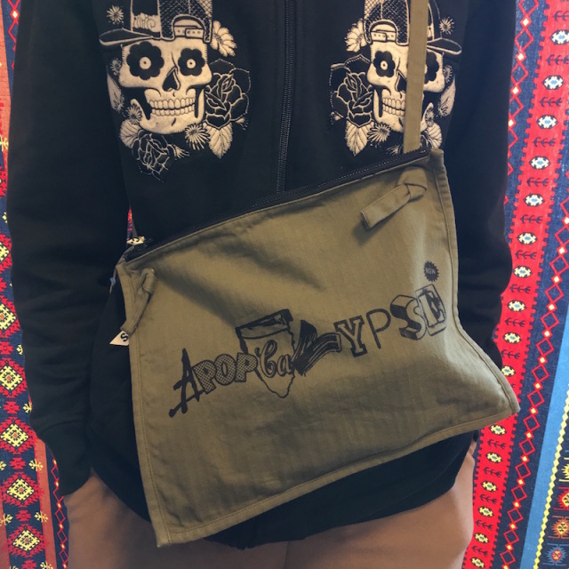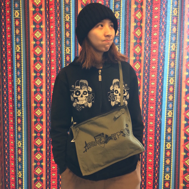 1600yen(Asia),2300yen.(North/Central America, Europe,Oceania), 3200yen(South America, Africa). D*Face's one of the popular artwork, Apopcalypse is now available as in herringbone sacosh!! Perfect item to cruise the city on fixed bike and skateboard. Available in WH and Olive.