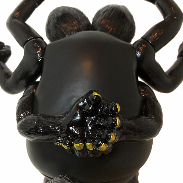 We, BlackBook Toy, are proud to announce the sofubi project with Magical Mosh Misfits!! 6 Arms 阿修羅(Asura) Rat Fink. Firstly appeared on tee, hoodie, skateboard released from MxMxM back in 2011 and going through some rejections, after 7years, it turned into MADE IN JAPAN sofubi. Needless to say, officially licensed by MOONEYES. Composed of crazy 13 parts, you can move not only his hands&arms, you can move his tail. Plus it comes with unpainted finger puppet as Omake(free prize), which Asura Rat Fink can hold in&on his hands. What's more Asura Rat Fink can hold finger board in his hand like original graphic. Please note finger board not included. This is BBT exclusive colorway, combo of GOLD x BK x Matte BK!! What's more they come in screen printed 2way bag(Knapsack and Tote bag). You might don't want to miss this masterpiece!!