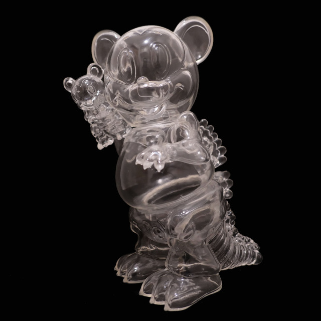 We, BlackBook Toy, are proud to announce the release of our new toy with renowned contemporary artist, Ron English! This "Mousezilla" is based off the character as seen on Ron's paintings such as "Times Square(2001") and "Last Cartoon(2002)"! This Emerald edition is casted in beautiful clear emerald green. Comes with mini Mousezilla, which is GR GID!! You can put mini inside Mousezilla so that he glows so rad!! It's our 1st time to sell blank Mousezilla. 5 points of articulation(head, arms, waist and tail). Sculpted by T9G! MADE IN JAPAN, Undeniable quality!! Standing 23cm.